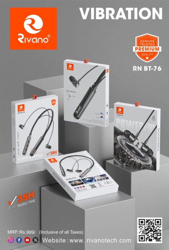 Rivano RN BT-76 Bluetooth Neckband – 250 Hours Standby Time