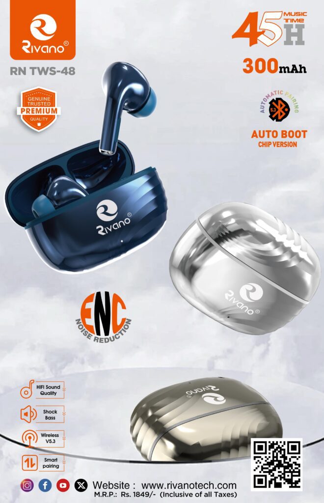 RIVANO RN TWS-48 45H MUSIC TIME 1200H STAND BY TIME ENC AUTO BOOT 300MAH BATTERY BUDS